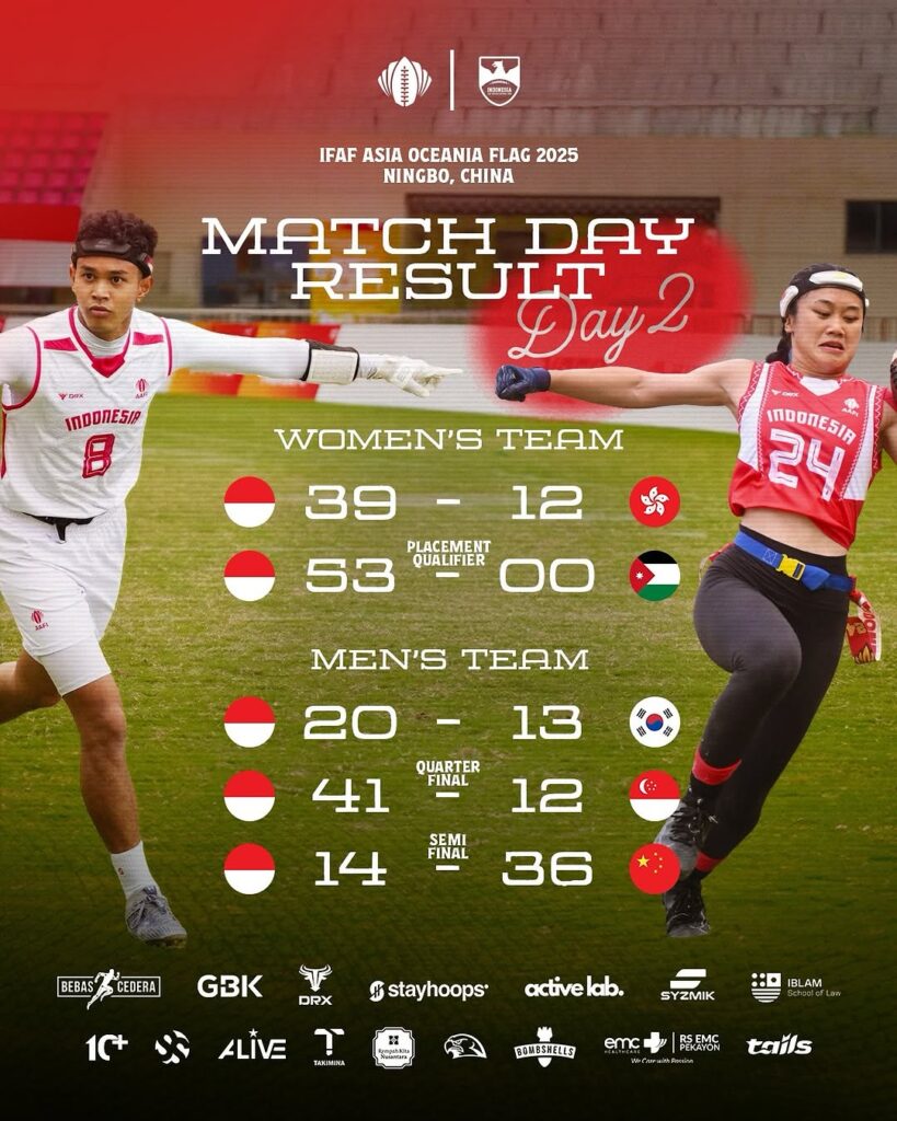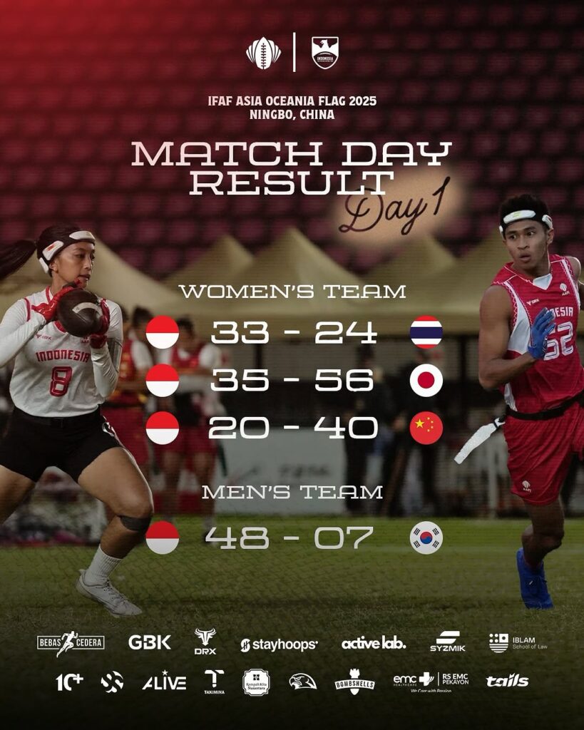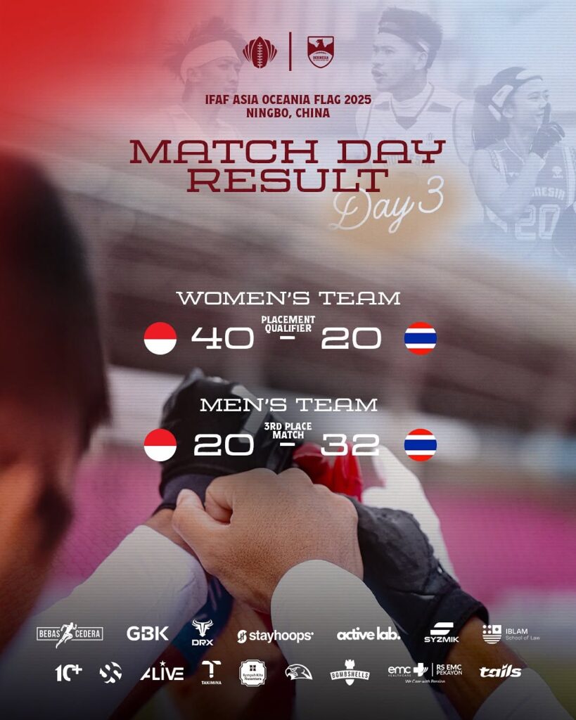 Selengkapnya hasil pertandingan Tim Nasional Flag Football Indonesia sebagai berikut: